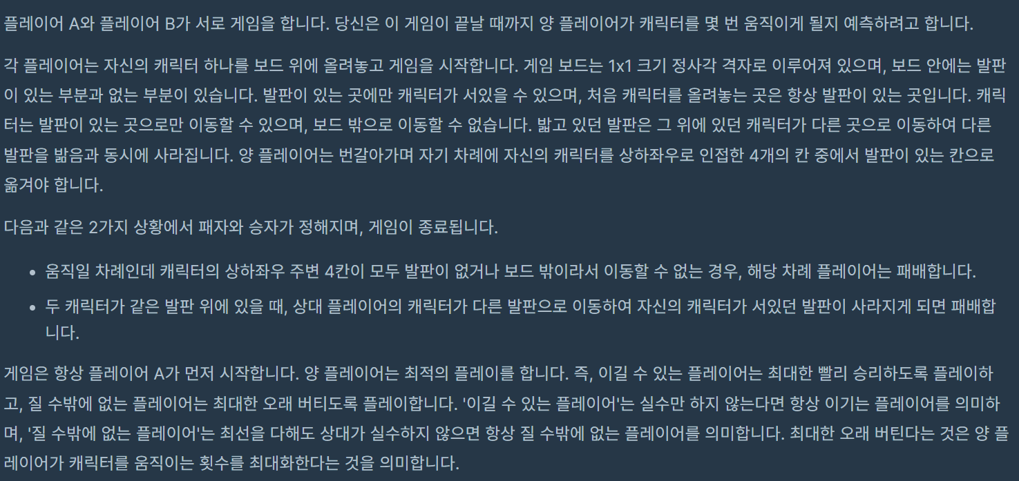 코딩테스트 연습 - 사라지는 발판 [[1, 1, 1], [1, 1, 1], [1, 1, 1]] [1, 0] [1, 2] 5 [[1, 1, 1], [1, 0, 1], [1, 1, 1]] [1, 0] [1, 2] 4 programmers.co.kr minmax tree를 사용해서 풀었다. game(board, aloc, bloc) 함수는 두가지 값을 반환 하는데 ( Tuple[bool, int] ) 첫번째는 이번 차례에 aloc가 이길 수 있는지 여부 두번째는 이길 수 있다면 최소 길이 못 이기면 최대 길이를 반환 한다. next_aloc는 aloc가 다음번에 이동할 칸의 위치이고, 이때 game(board, bloc, next_aloc) 반환 값을 이용해 최적의 플레이를 하도록 한다. from typing..
